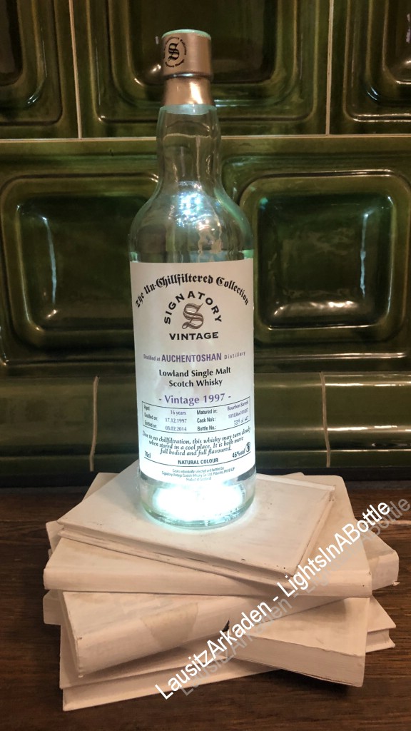 Damit Sie sich ein Bild von der Wirkung der unterschiedlichen Beleuchtungsvarianten machen können, haben von jeder Flasche ein Bild mit Beleuchtung vom Flaschenboden und mit der LED-Lichterkette gemacht.