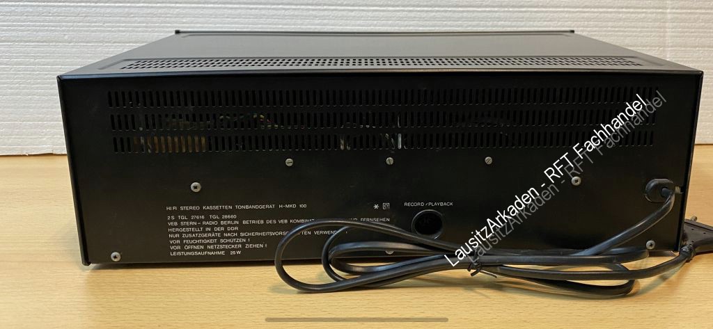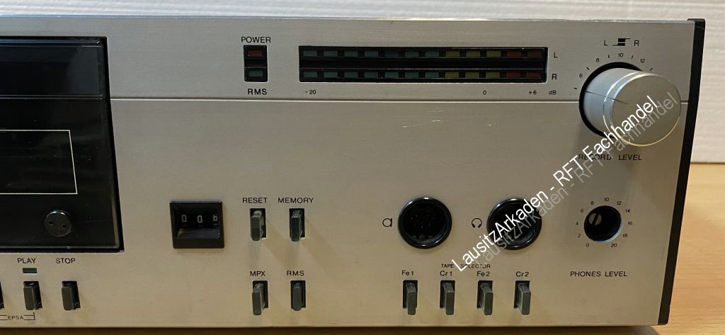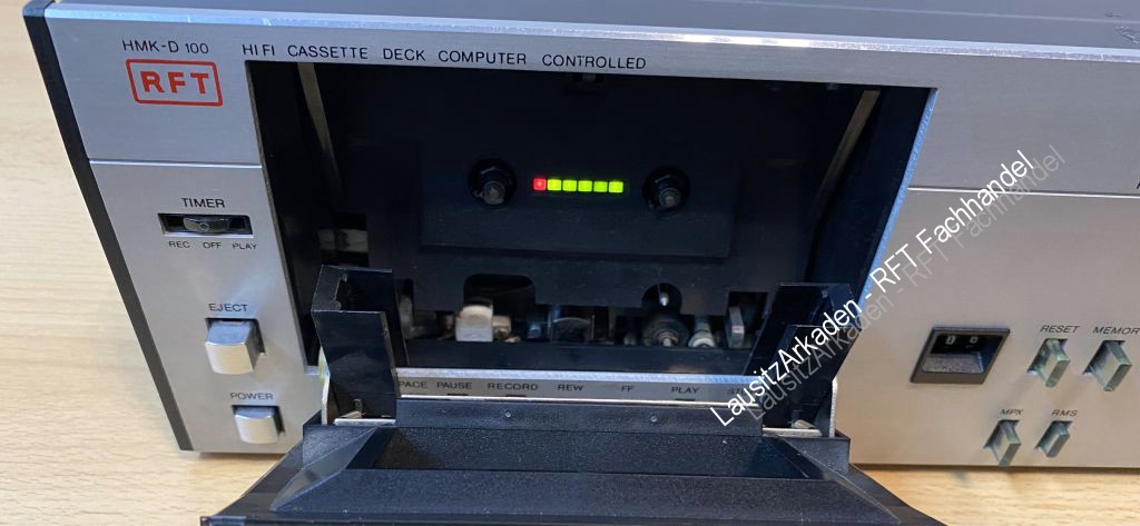 | Sicherungshalter gereinigt. Sicherungen ersetzt. Getestete Funktionen : - Kassettenfach öffnen = i.O. - Wiedergabe = i.O. - Vor- und Rücklauf = i.O. - Pause und Stop = i.O. - Banzählwerk = i.O. -Bandzählwerk zurücksetzen = i.O. - Levelanzeige rechts und links = i.O. Aufnahmefunktion nicht getestet. Kopfhörerausgang nicht getestet. Der Lautstärkeregler für die Kopfhörer fehlt auf den Bildern, ist aber dabei! Alle Regler und Knöpfe lassen sich schalten/drehen/schieben. Optisch mit Gebrauchsspuren (siehe Bilder). |
