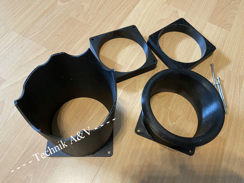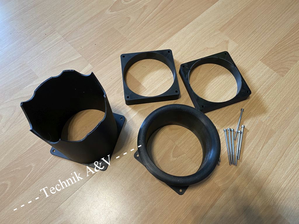 Das Kit besteht aus zwei Abstandsstücken die zwischen Miner und Lüfter geschraubt werden sowie zwei Lufteinlass- und Luftauslasstrichtern.