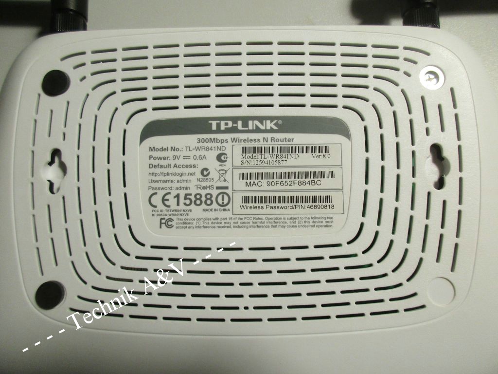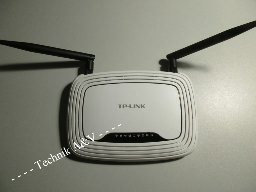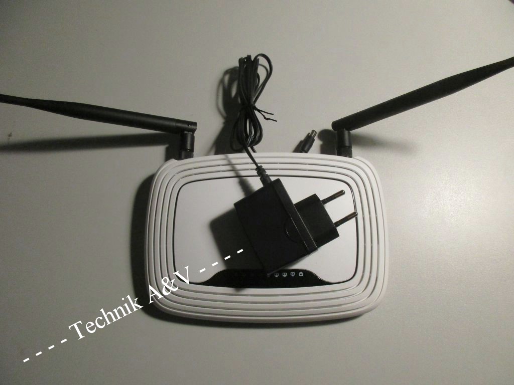 Router von TP-Link mit der Bezeichnung TL-WR841ND mit Netzteil und Ethernet-Kabel.