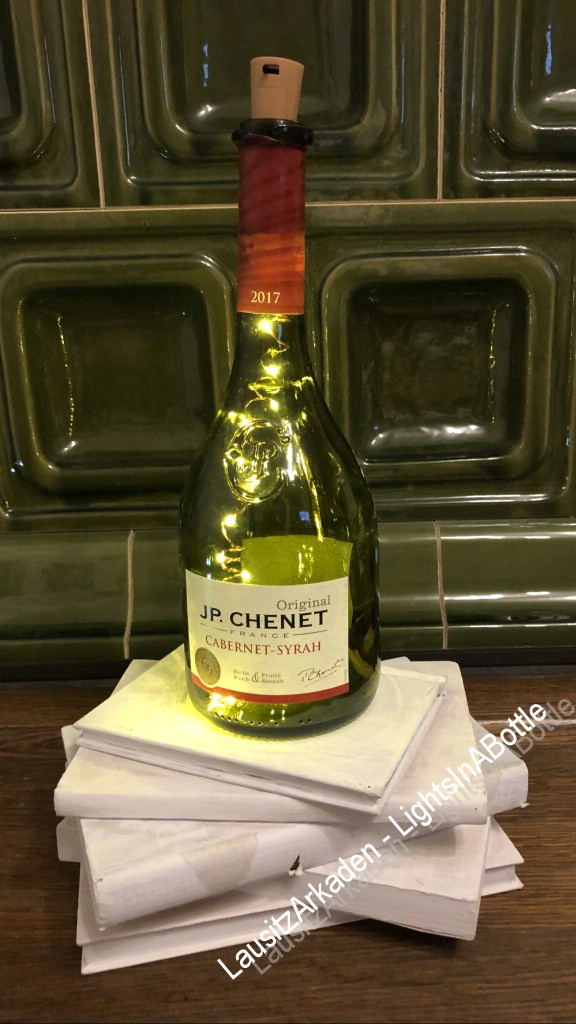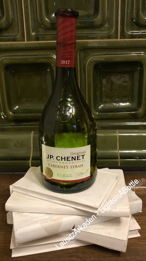 Damit Sie sich ein Bild von der Wirkung der unterschiedlichen Beleuchtungsvarianten machen können, haben von jeder Flasche ein Bild mit Beleuchtung vom Flaschenboden und mit der LED-Lichterkette gemacht.
