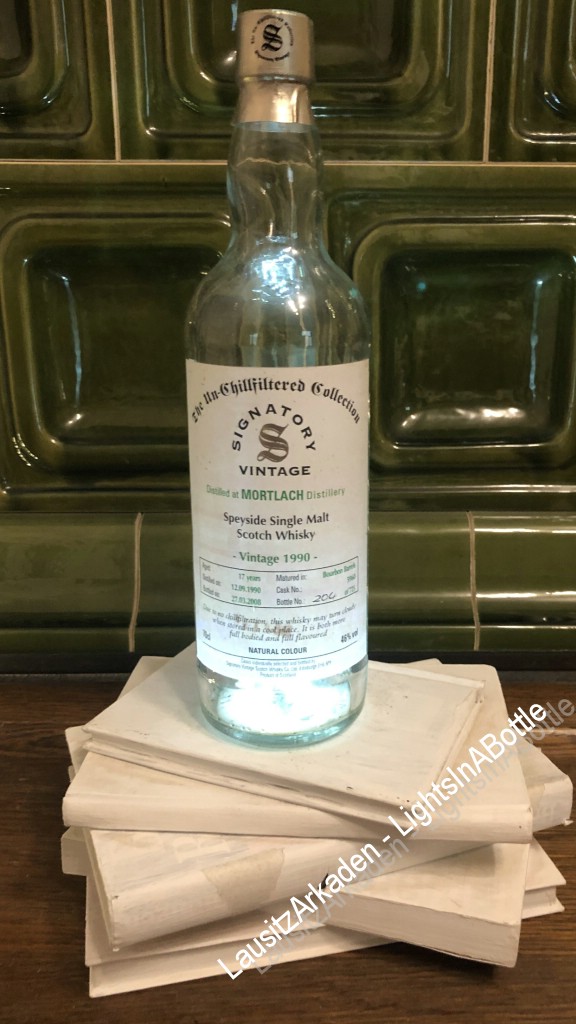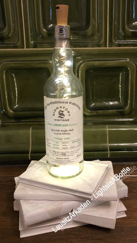 Damit Sie sich ein Bild von der Wirkung der unterschiedlichen Beleuchtungsvarianten machen können, haben von jeder Flasche ein Bild mit Beleuchtung vom Flaschenboden und mit der LED-Lichterkette gemacht.