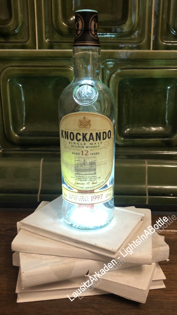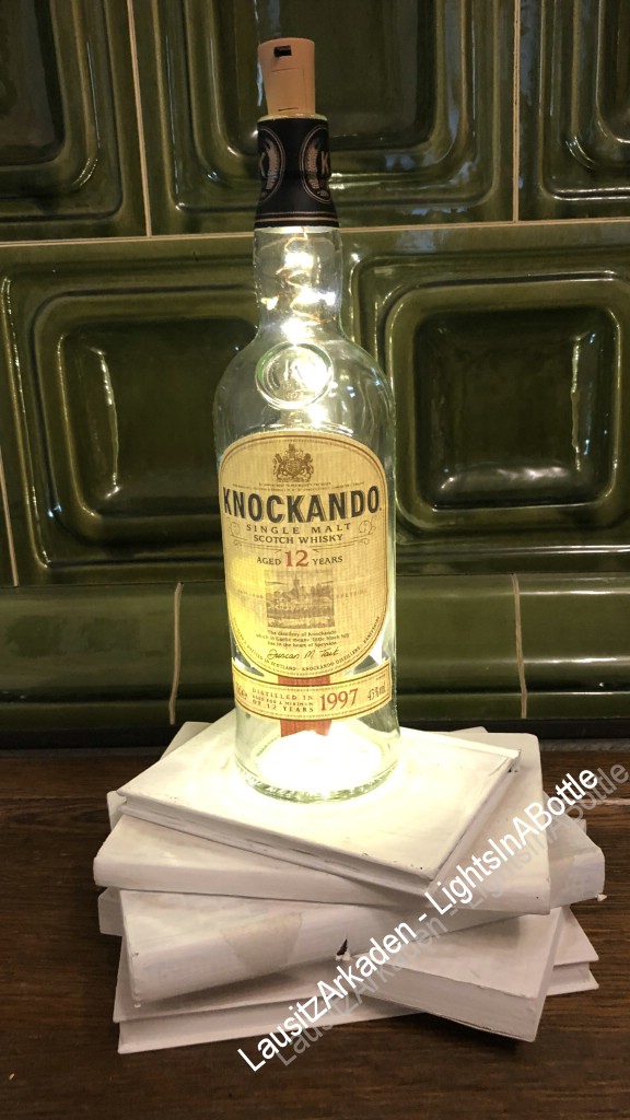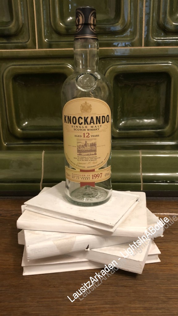 Damit Sie sich ein Bild von der Wirkung der unterschiedlichen Beleuchtungsvarianten machen können, haben von jeder Flasche ein Bild mit Beleuchtung vom Flaschenboden und mit der LED-Lichterkette gemacht.