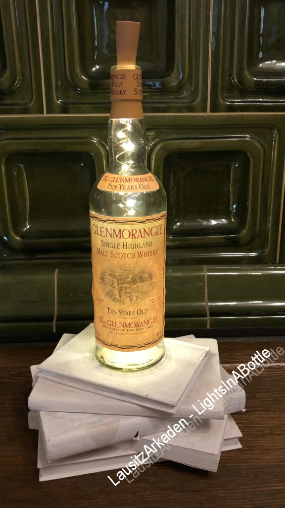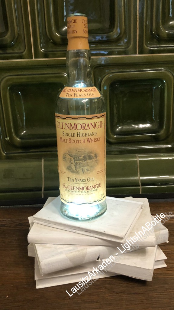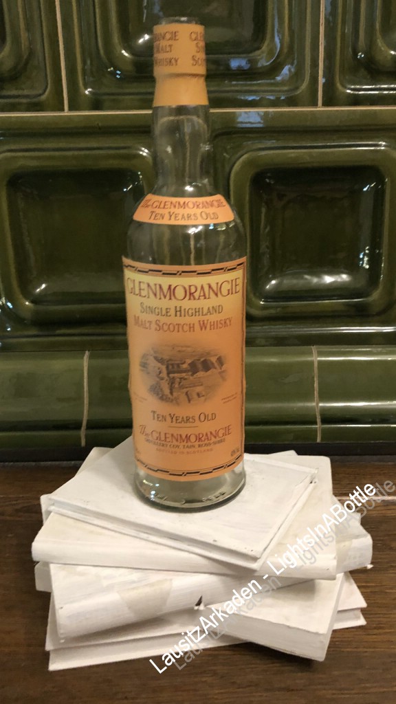 Damit Sie sich ein Bild von der Wirkung der unterschiedlichen Beleuchtungsvarianten machen können, haben von jeder Flasche ein Bild mit Beleuchtung vom Flaschenboden und mit der LED-Lichterkette gemacht.