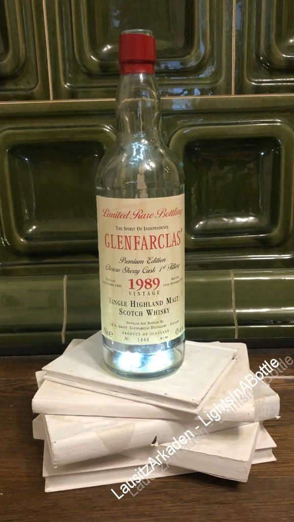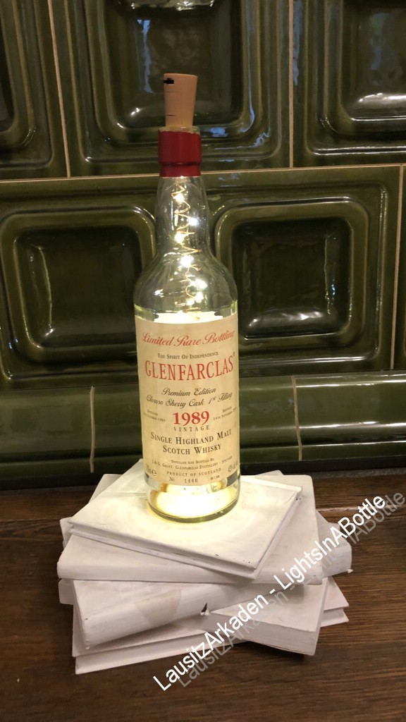 Damit Sie sich ein Bild von der Wirkung der unterschiedlichen Beleuchtungsvarianten machen können, haben von jeder Flasche ein Bild mit Beleuchtung vom Flaschenboden und mit der LED-Lichterkette gemacht.