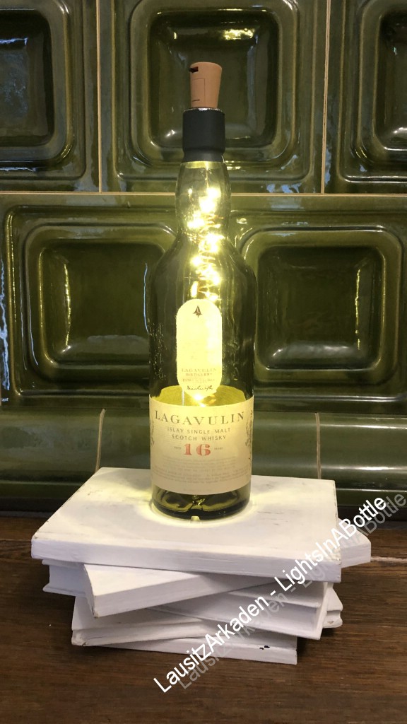 Whiskyflasche - Lagavulin - hellgrün: Korken mit LED-Lichtern - gelb - Mit Tubus