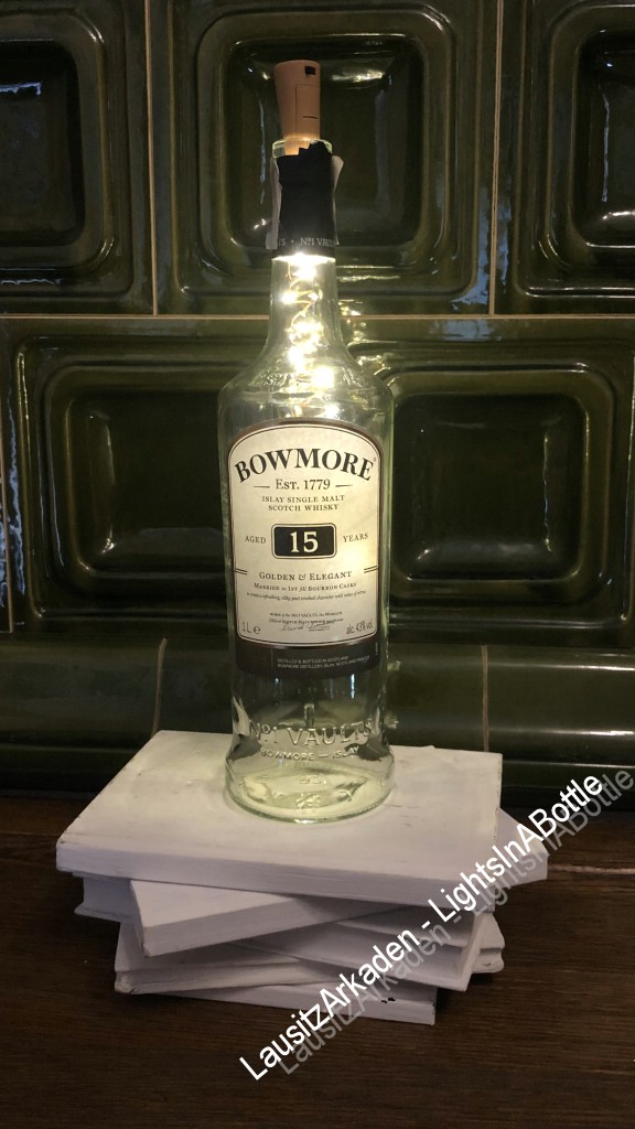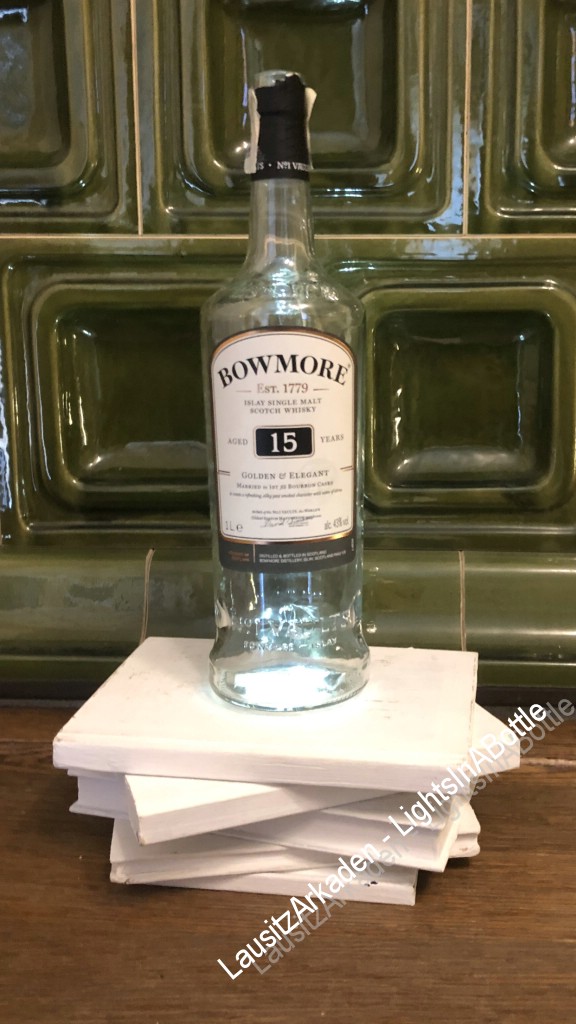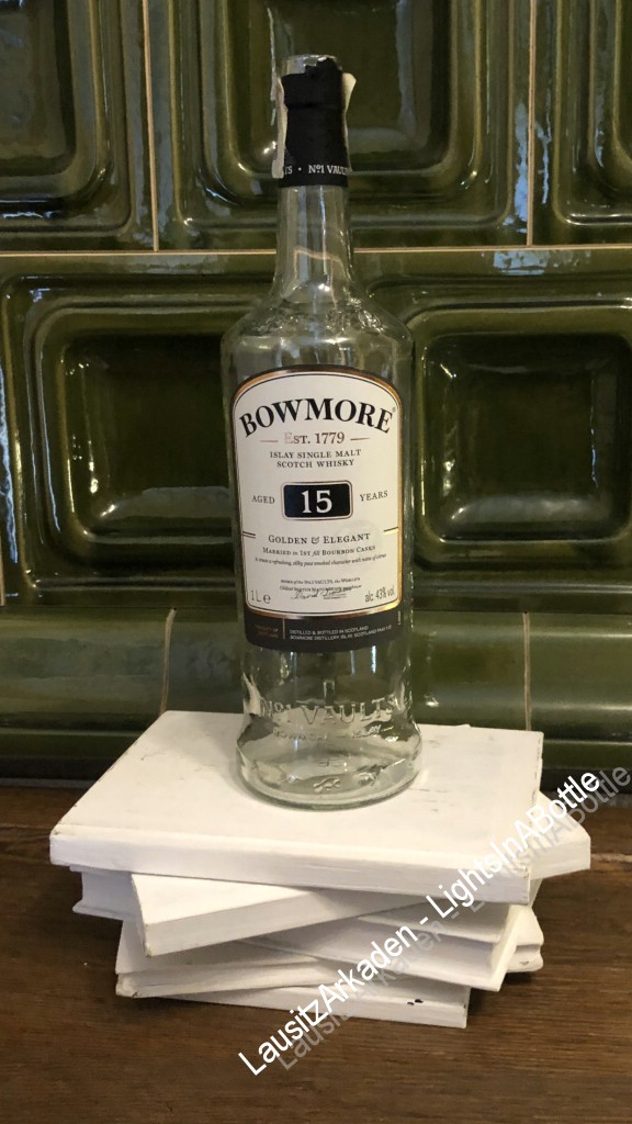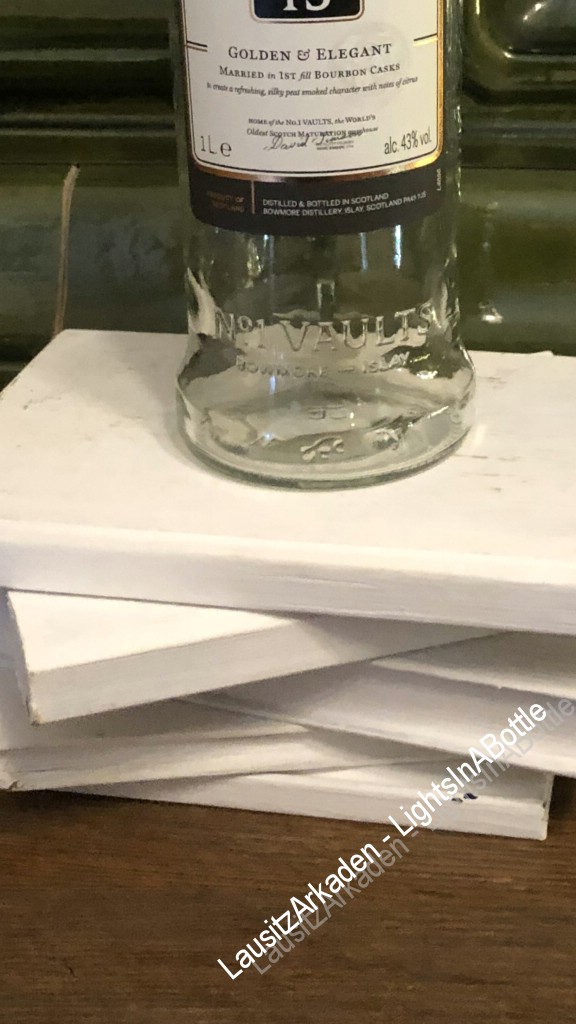 Damit Sie sich ein Bild von der Wirkung der unterschiedlichen Beleuchtungsvarianten machen können, haben von jeder Flasche ein Bild mit Beleuchtung vom Flaschenboden und mit der LED-Lichterkette gemacht.