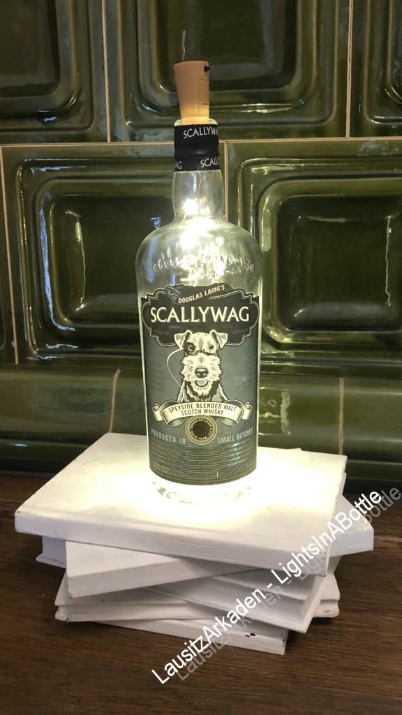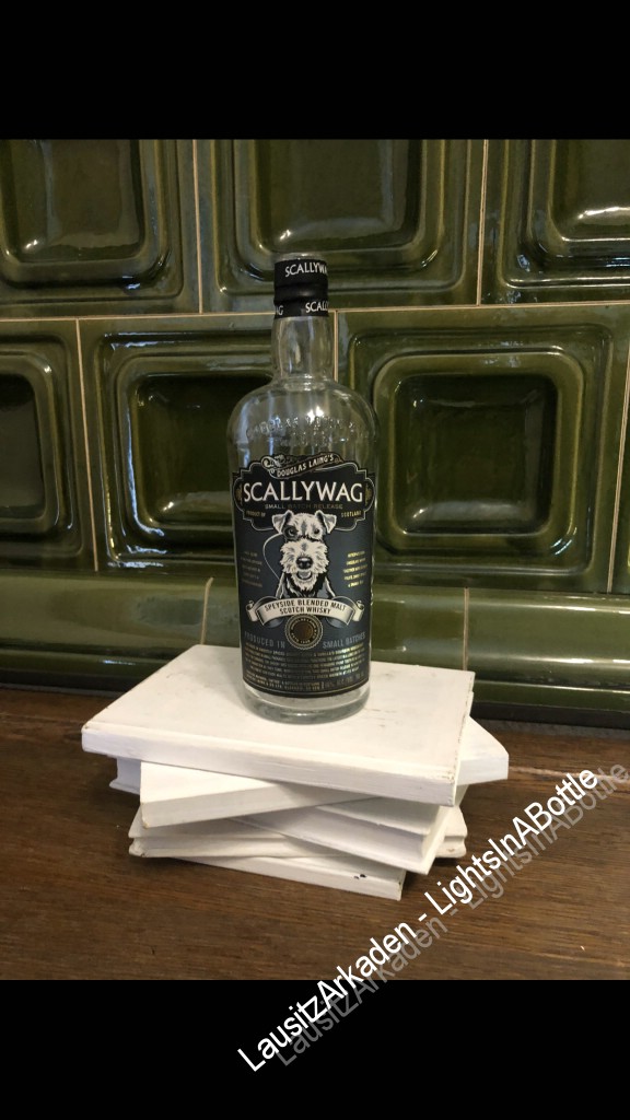 Damit Sie sich ein Bild von der Wirkung der unterschiedlichen Beleuchtungsvarianten machen können, haben von jeder Flasche ein Bild mit Beleuchtung vom Flaschenboden und mit der LED-Lichterkette gemacht.