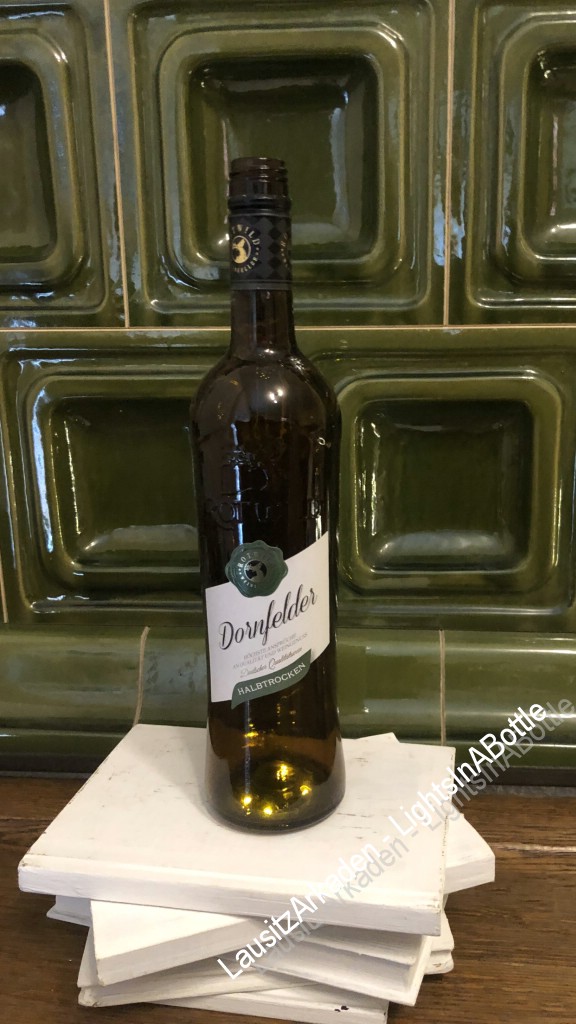 Damit Sie sich ein Bild von der Wirkung der unterschiedlichen Beleuchtungsvarianten machen können, haben von jeder Flasche ein Bild mit Beleuchtung vom Flaschenboden und mit der LED-Lichterkette gemacht.