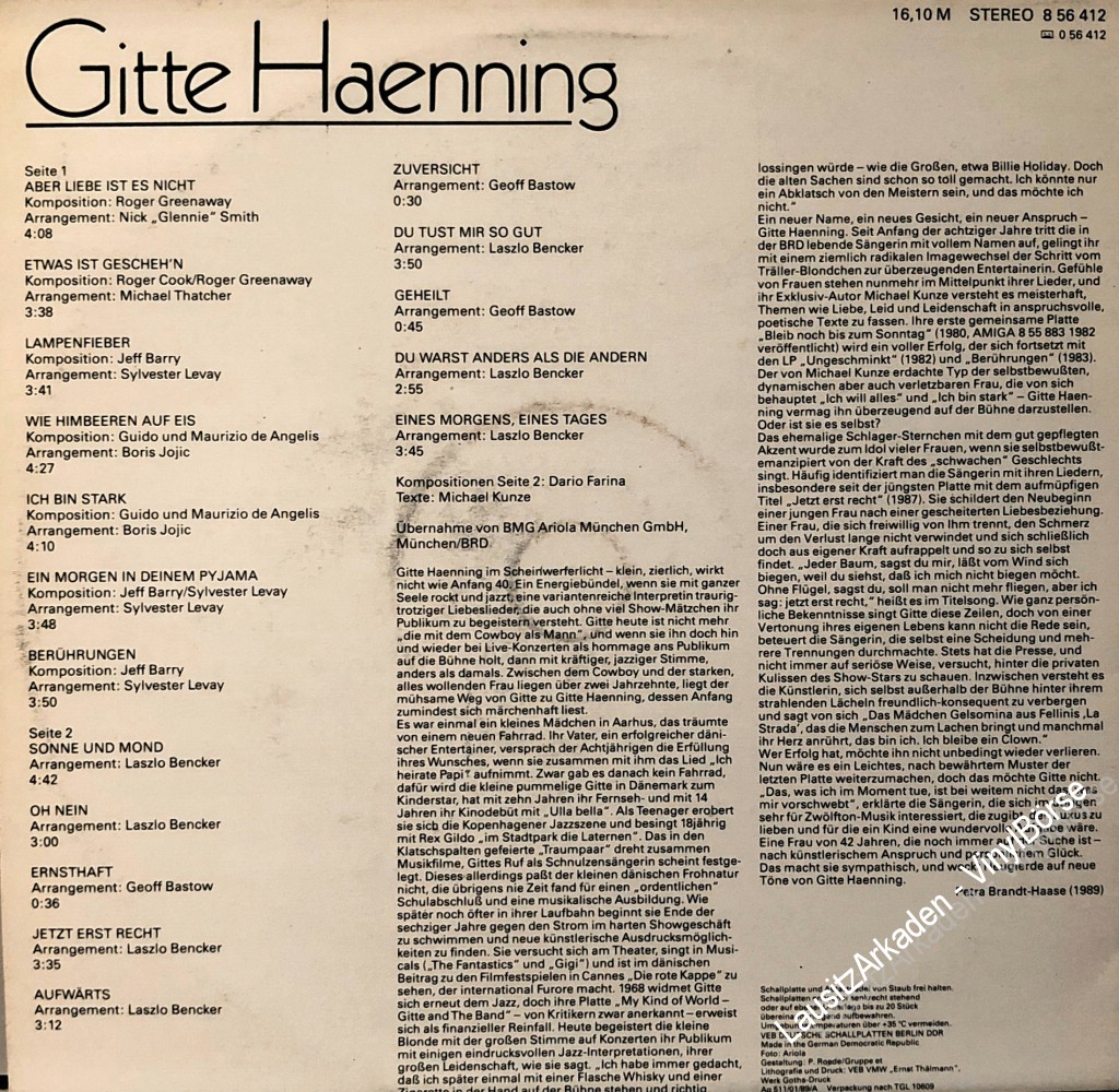 Hallo liebe Vinyl-Freunde,wir bieten euch hier ein paar Stücke aus unserem Plattenladen an. Es handelt sich dabei ausschließlich um Originalware bekannter Label aus den 60er, 70er und 80er Jahren. LP - Amiga ( 856412 ) - Gitte Haenning - Gitte HaenningKlicken Sie auf das Bild um das Cover mit der T ...Weiterlesen