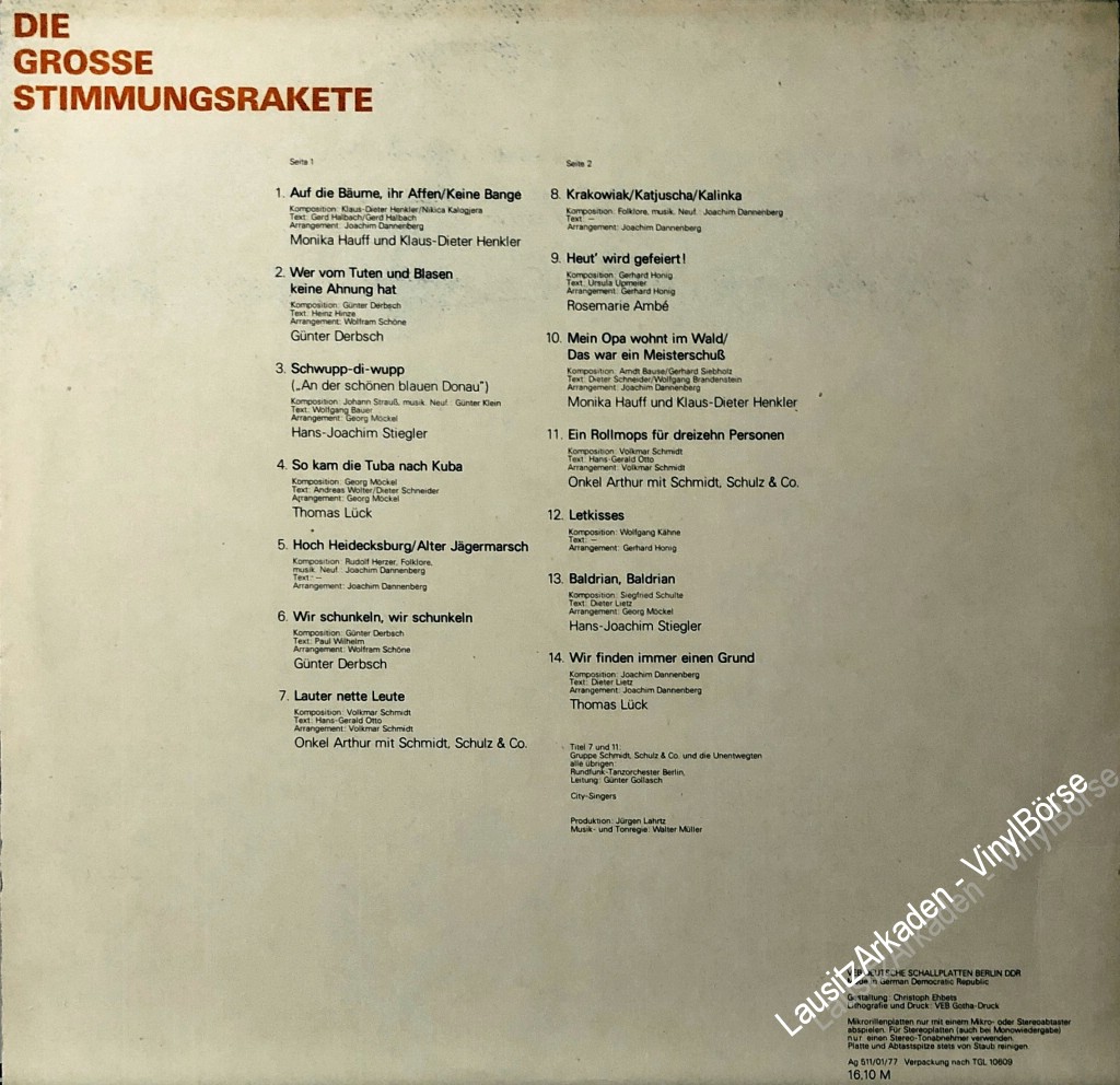 Hallo liebe Vinyl-Freunde,wir bieten euch hier ein paar Stücke aus unserem Plattenladen an. Es handelt sich dabei ausschließlich um Originalware bekannter Label aus den 60er, 70er und 80er Jahren. LP - Amiga ( 855571 ) - Die große StimmungsraketeKlicken Sie auf das Bild um das Cover mit der Titelüb ...Weiterlesen