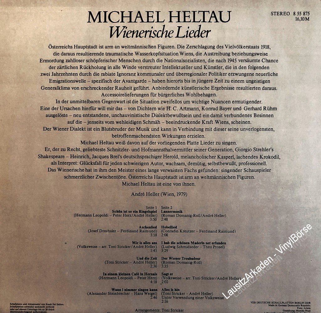 Hallo liebe Vinyl-Freunde,wir bieten euch hier ein paar Stücke aus unserem Plattenladen an. Es handelt sich dabei ausschließlich um Originalware bekannter Label aus den 60er, 70er und 80er Jahren. LP - Amiga ( 855875 ) - Michael Heltau - Wienerische LiederKlicken Sie auf das Bild um das Cover mit d ...Weiterlesen