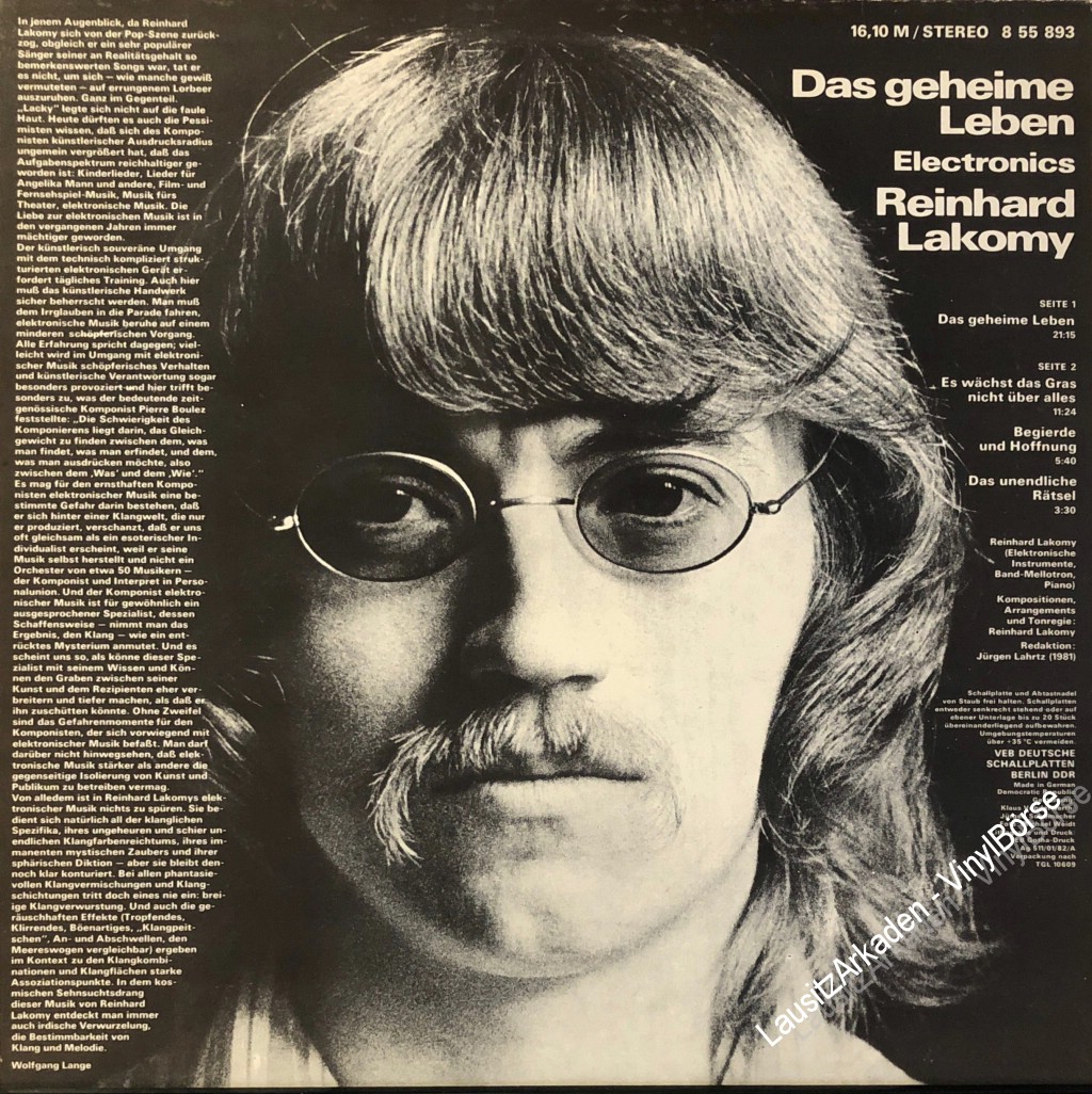 Hallo liebe Vinyl-Freunde,wir bieten euch hier ein paar Stücke aus unserem Plattenladen an. Es handelt sich dabei ausschließlich um Originalware bekannter Label aus den 60er, 70er und 80er Jahren. LP - Amiga ( 855893 ) - Reinhard Lakomy - Das geheime LebenKlicken Sie auf das Bild um das Cover mit d ...Weiterlesen