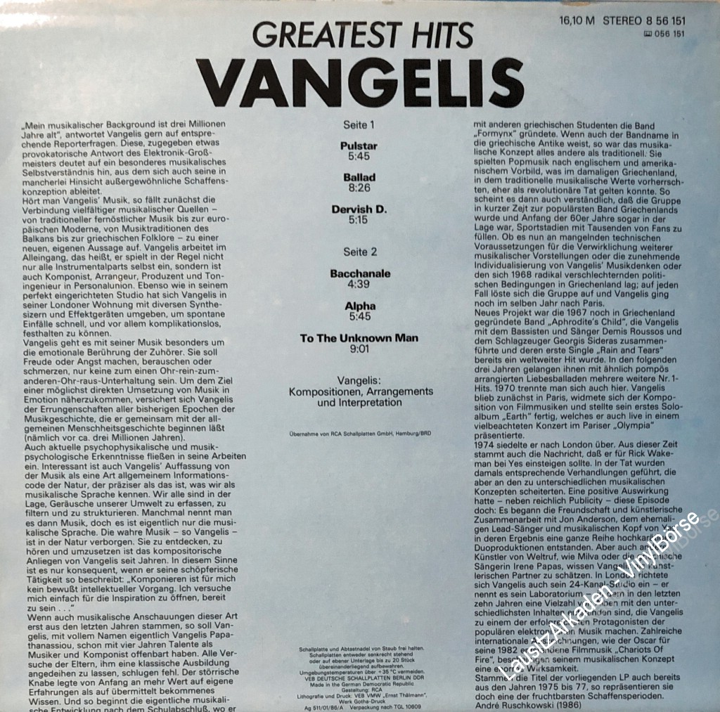Hallo liebe Vinyl-Freunde,wir bieten euch hier ein paar Stücke aus unserem Plattenladen an. Es handelt sich dabei ausschließlich um Originalware bekannter Label aus den 60er, 70er und 80er Jahren. LP - Amiga ( 856151 ) - Vangelis - Greatest Hits Klicken Sie auf das Bild um das Cover mit der Titelüb ...Weiterlesen