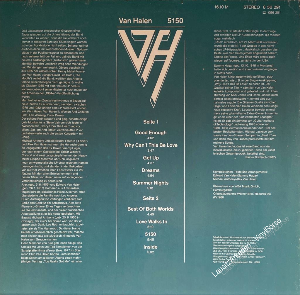 Hallo liebe Vinyl-Freunde,wir bieten euch hier ein paar Stücke aus unserem Plattenladen an. Es handelt sich dabei ausschließlich um Originalware bekannter Label aus den 60er, 70er und 80er Jahren. LP - Amiga ( 856291 ) - Van Halen - 5150Klicken Sie auf das Bild um das Cover mit der Titelübersicht i ...Weiterlesen