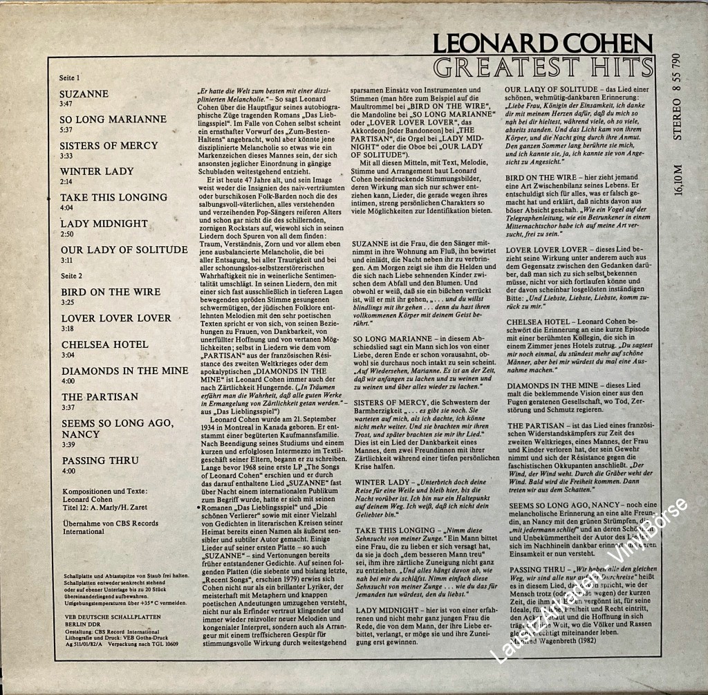 Hallo liebe Vinyl-Freunde,wir bieten euch hier ein paar Stücke aus unserem Plattenladen an. Es handelt sich dabei ausschließlich um Originalware bekannter Label aus den 60er, 70er und 80er Jahren. LP - Amiga ( 855790 ) - Leonhard Cohen - Greatest HitsKlicken Sie auf das Bild um das Cover mit der Ti ...Weiterlesen