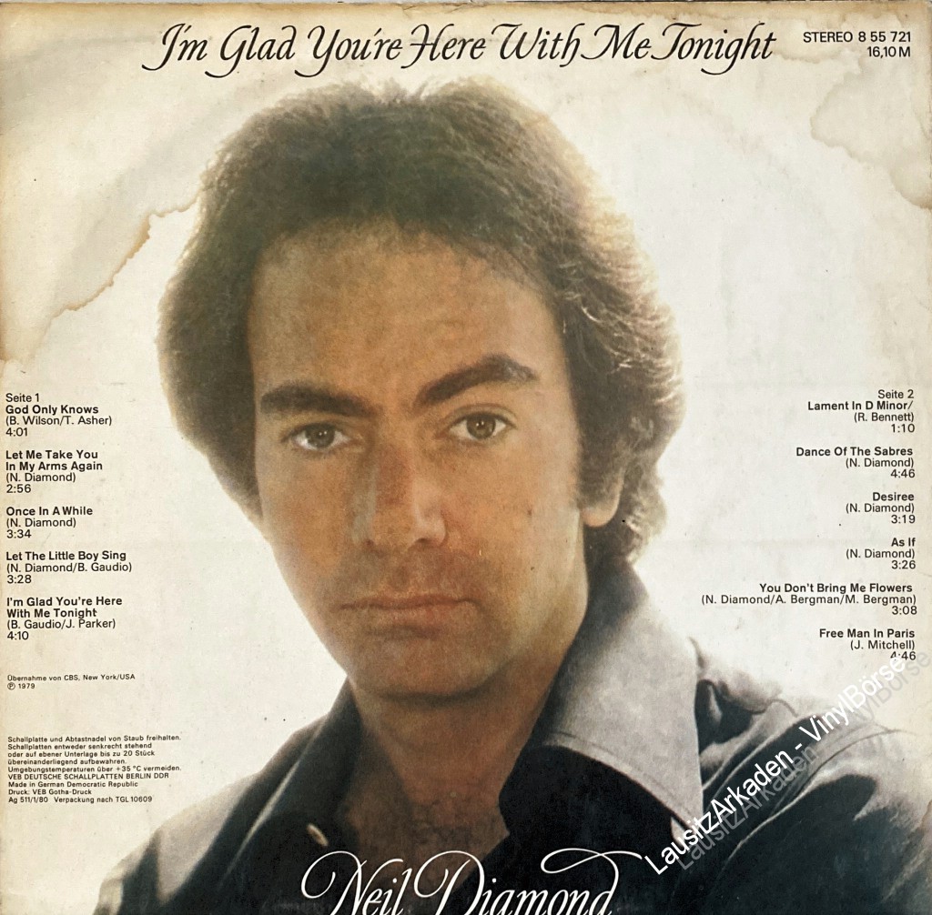 Hallo liebe Vinyl-Freunde,wir bieten euch hier ein paar Stücke aus unserem Plattenladen an. Es handelt sich dabei ausschließlich um Originalware bekannter Label aus den 60er, 70er und 80er Jahren. LP - Amiga ( 855721 ) - Neil Diamond - I´m glad you´re here with me tonightKlicken Sie auf das Bild um ...Weiterlesen