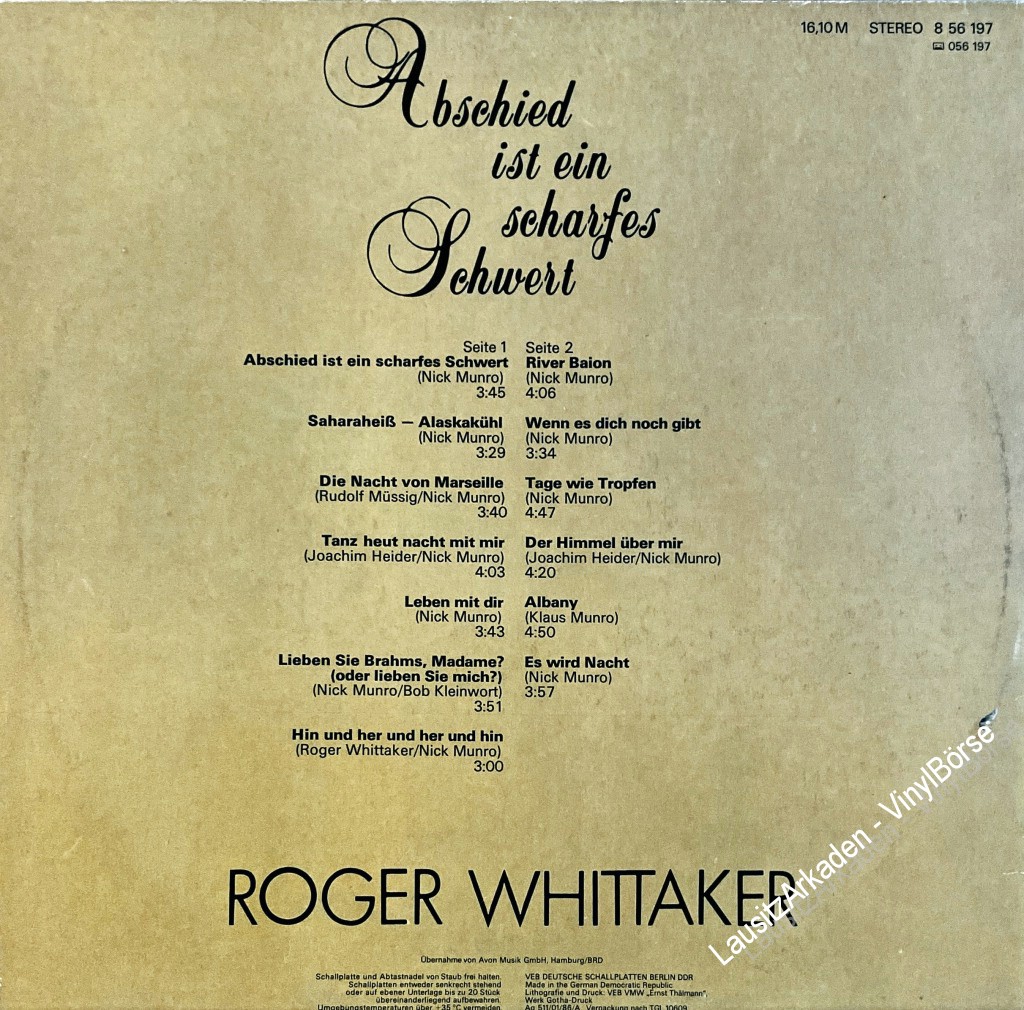Hallo liebe Vinyl-Freunde,wir bieten euch hier ein paar Stücke aus unserem Plattenladen an. Es handelt sich dabei ausschließlich um Originalware bekannter Label aus den 60er, 70er und 80er Jahren. LP - Amiga ( 856197 ) - Roger Whittaker - Abschied ist ein scharfes SchwertKlicken Sie auf das Bild um ...Weiterlesen