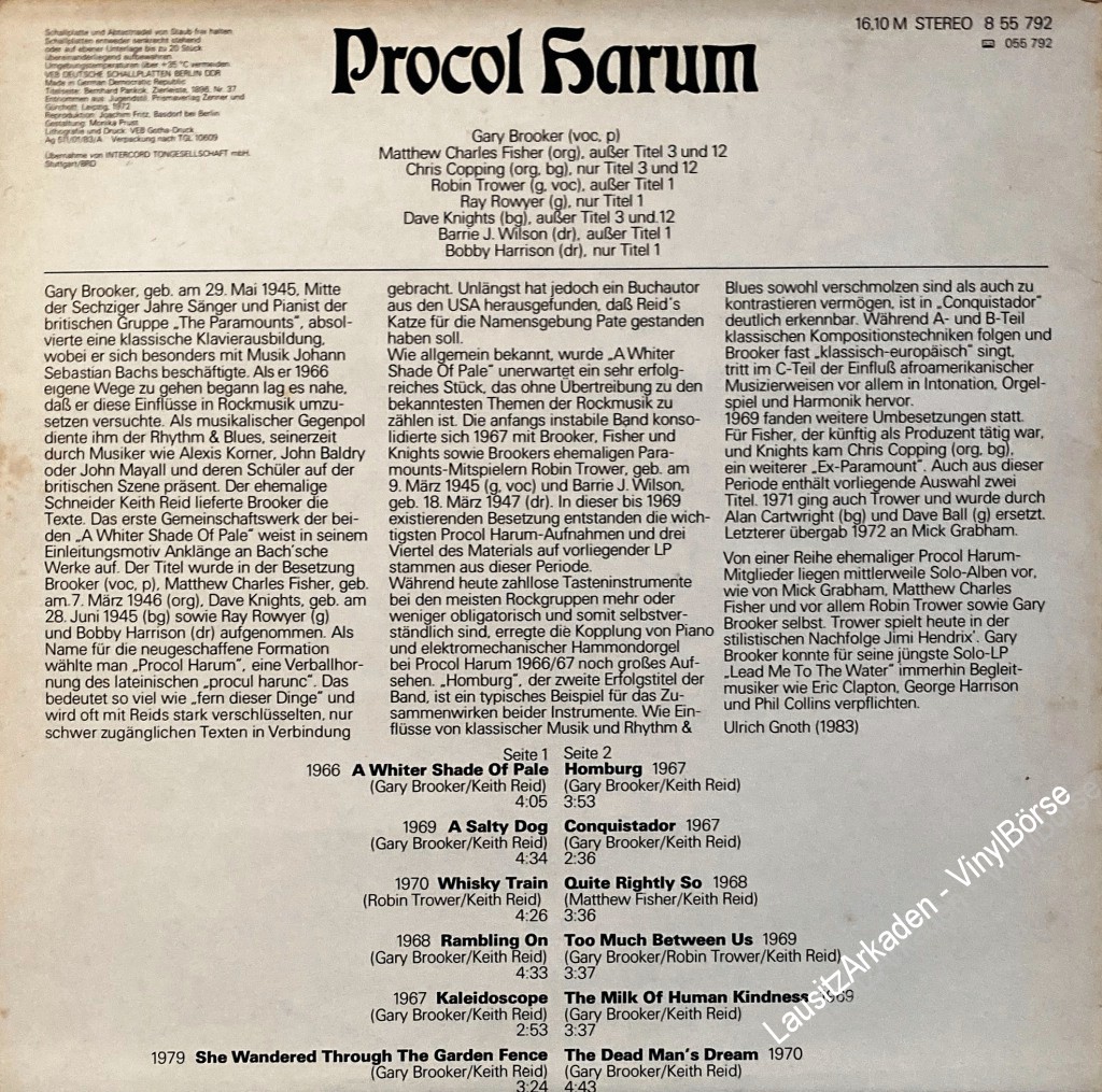 Hallo liebe Vinyl-Freunde,wir bieten euch hier ein paar Stücke aus unserem Plattenladen an. Es handelt sich dabei ausschließlich um Originalware bekannter Label aus den 60er, 70er und 80er Jahren. LP - Amiga ( 855792 ) - Procol Harum - Procol HarumKlicken Sie auf das Bild um das Cover mit der Titel ...Weiterlesen