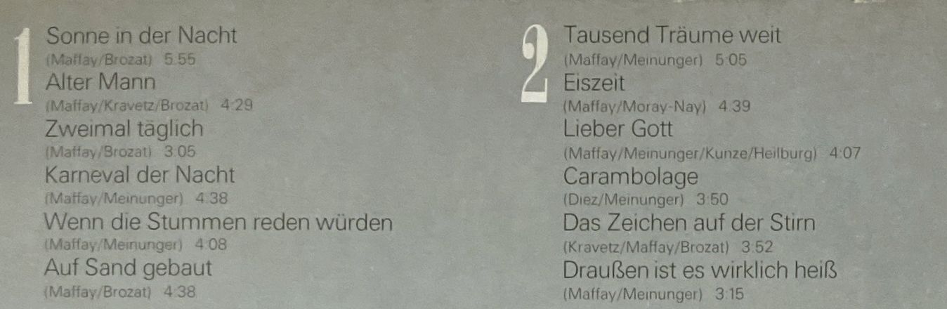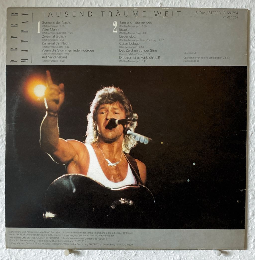 Hallo liebe Vinyl-Freunde,wir bieten euch hier ein paar Stücke aus unserem Plattenladen an. Es handelt sich dabei ausschließlich um Originalware bekannter Label aus den 60er, 70er und 80er Jahren. LP - Amiga ( 856254 ) - Peter Maffay - Tausend Träume weitKlicken Sie auf das Bild um das Cover mit de ...Weiterlesen