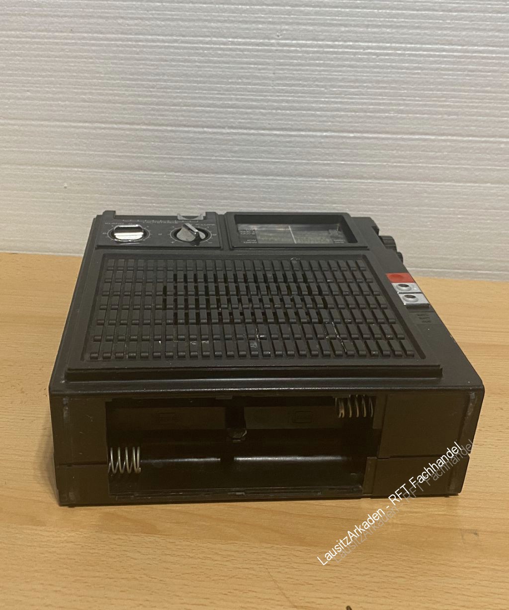 | Gerät lässt sich einschalten. Senderwahl nicht möglich. Abstimmknopf dreht sehr leicht. Wahrscheinlich Seilzug gerissen. Die Deckel von Batterie- und Netzkabelfach sind vorhanden. Antenne intakt. Alle Regler und Knöpfe lassen sich schalten/drehen. Optisch mit Gebrauchsspuren (siehe Bilder). |