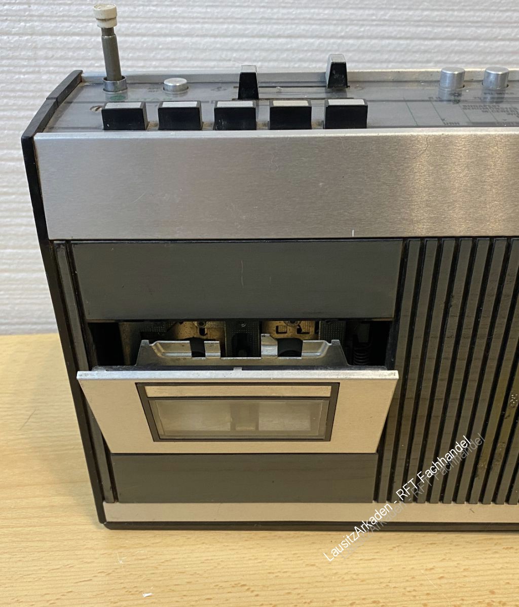 | UKW-Empfang = schlecht, Antenne defekt. MW-KW Empfang : keine Sender empfangbar. Abstimmung = leichtgängig. Kassettenfach öffnet. Wiedergabe = funktioniert (leiert etwas) Vor- und Rückspulen = funktioniert Aufnahme = nicht getestet Tragebügel verbogen/nicht vollständig. Alle Regler und Knöpfe lassen sich schalten/drehen/schieben. Optisch mit Gebrauchsspuren (siehe Bilder). |