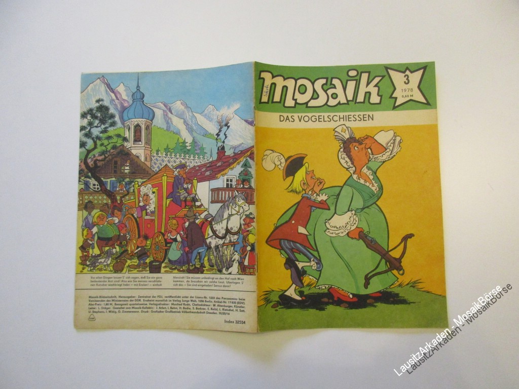 Liebe Mosaikfreunde,wir verkaufen hier das original MosaikHeft 03 von 1978 - Das VogelschießenArtikelnummer : 25001362in Zustand : 2.2 / Z4 Bitte beachten Sie unsere Informationen zur Bewertung der Hefte !DeckblattAbostempel : 1 = neinPapier : 4 = Deckblatt lose und/oder stark fleckig, bemalt, b ...Weiterlesen